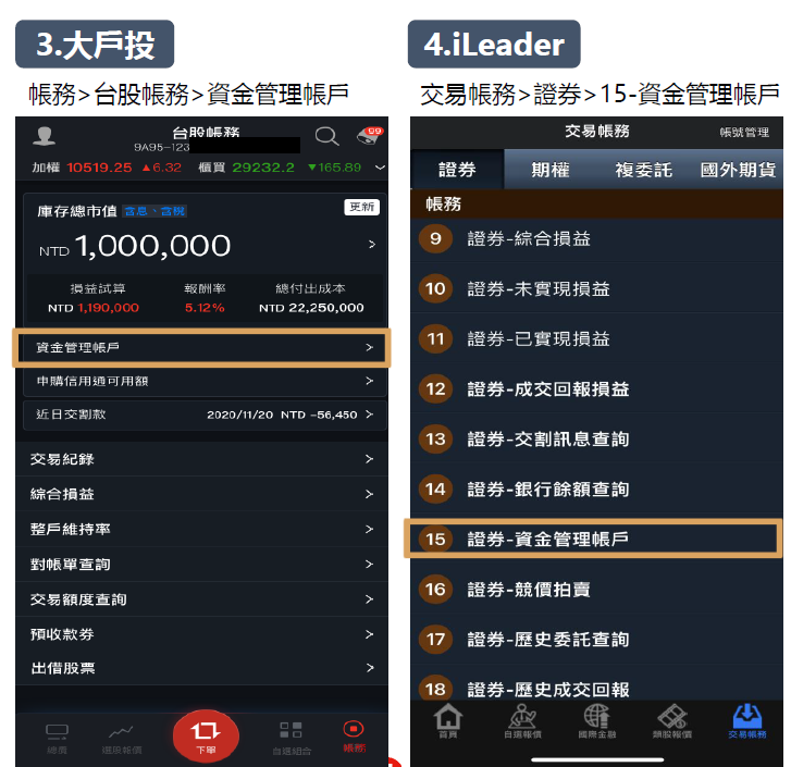 2、【iLeader】登入>交易帳務>證券帳務>15 證券-資金管理帳戶