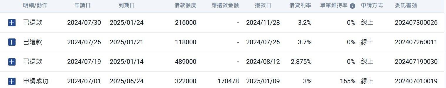 從以下3個途徑,進入借貸畫面後,會看到申請日、到期日、借款金額、借款利率、單筆維持率 等資訊。